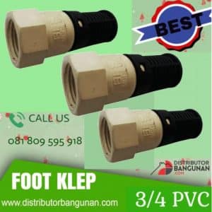 Foot klep ini dipasang pada pompa air dibawah sumur pada ujung bawah pralon hisap. Foot klep ini berfungsi untuk menahan air agar tidak kembali lagi ke bawah. Alat ini wajib dipasang pada pompa air agar pompa berfungsi dengan baik. Tanpa menggunakan alat ini kita akan kerepotan karena pompa air harus selalu dipancing airnya agar mesin pompa bisa berjalan. Alat ini bisa anda dapatkan di toko bahan bangunan, Selain berfungsi sebagai klep, alat ini juga sekaligus berfungsi untuk menyaring air, agar kotoran atau pasir yang ada pada sumur tidak ikut terhisap yang akan menyebabkan kerusakan pada mesin pompa air, khususnya pada impeler pompa akan cepat mengalami kerusakan karena gesekan pasir yang masuk ke mesin pompa tersebut. Oleh karena itu supplier atau grosir bahan bangunan menjual kebutuhan foot klep ini supaya kebutuhan konsumen untuk perlengkapan saluran air dapat terpenuhi. Harga Murah dan special untuk pelanggan dari distributorbangunan.com. Hubungi kami sekarang juga untuk mendapatkan discount special.